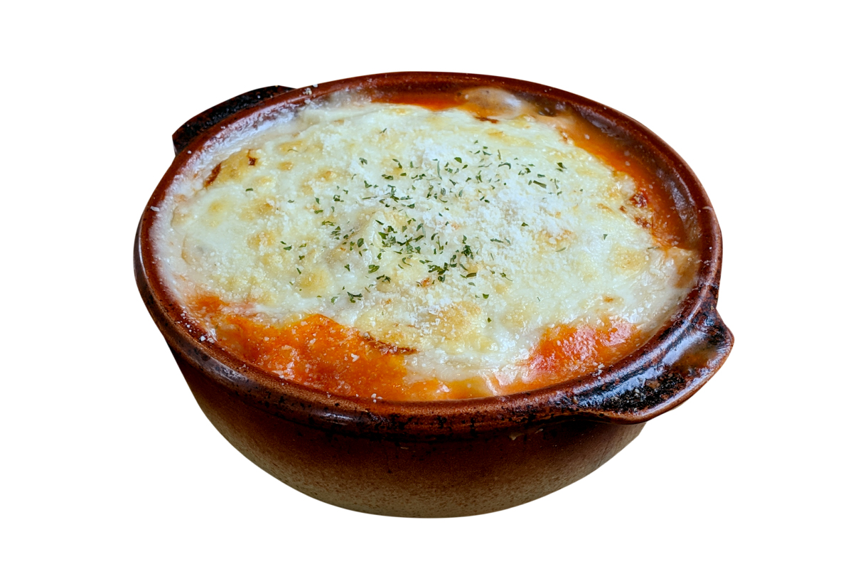 トマトソースのグラタンの中に自慢のハンバーグが入ったボリューミーな一品です。