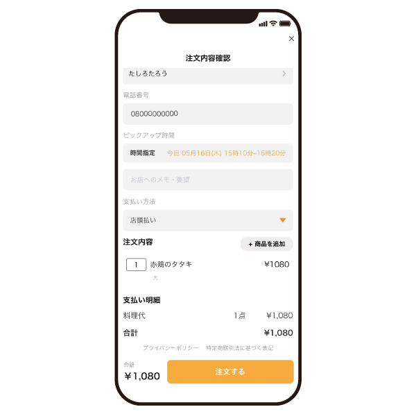 注文内容確認の画面が表示されますので、お名前・電話番号・受取日時・支払方法を入力、又は選択します。
