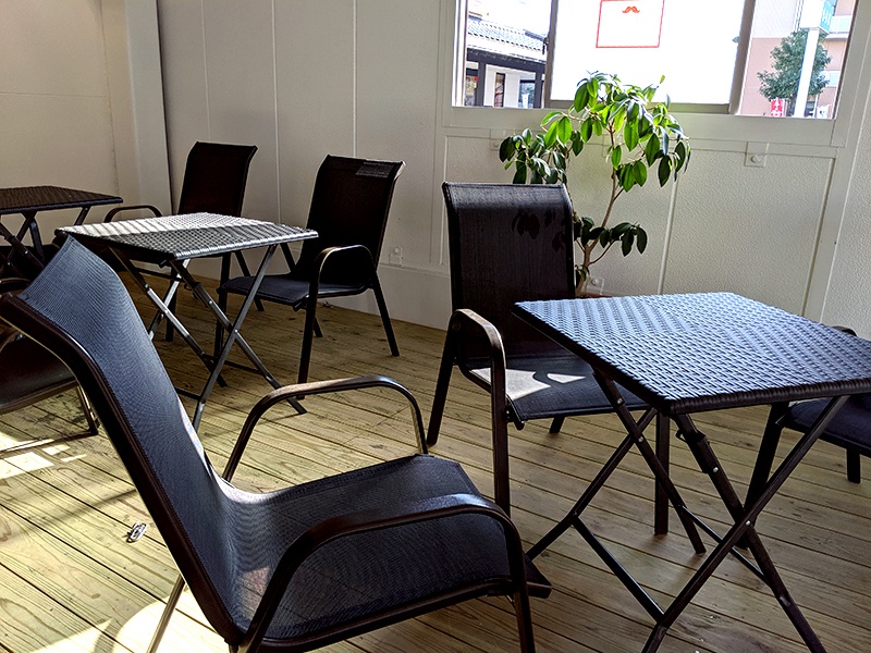 宮崎県都城市中町にある「mallmall都城市立図書館」とお煎餅の「もち吉 都城店」さんの間にある、マルヨコブリッジビル1Fに黒髭珈琲はあります。入口前には解放感のあるオープンテラスがあり、愛犬などペットの同伴が出来ますので、お散歩の休憩等にぜひお立ち寄りください。美味しい珈琲とスイーツをご用意してお待ちしております。パスタなど軽食のメニューもございます。テイクアウトも出来ます♪